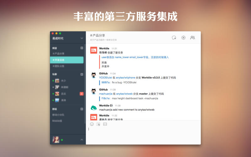 纷云拥有强大的与第三方服务整合的能力,现在已经提供了微博、微信、邮件、监控宝、GitHub等76种服务,而且还在快速的增加中。如果内置的服务无法满足你的团队需要,还可以通过我们提供的自定义WebHook与外部服务整合。