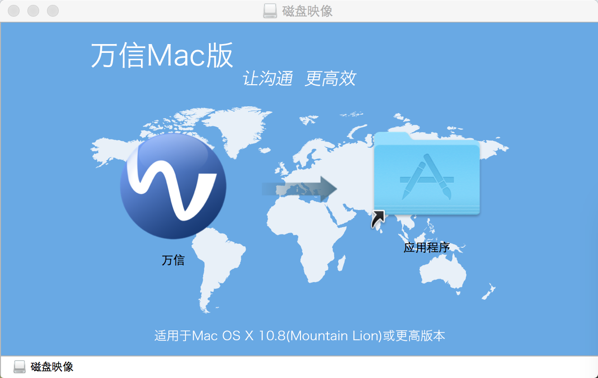 2、从下载目录中找到安装包,并双击打开进入安装界面,点击窗口中的『万信』图标并按住鼠标左键拖动到『应用程序』图标上松开图标即完成了万信的安装