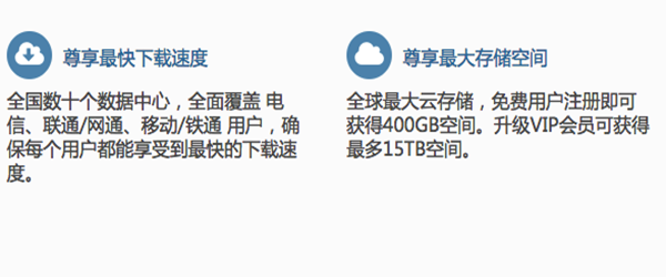 全球最大云存储,免费用户注册即可获得400GB空间。升级VIP会员可获得最多15TB空间。