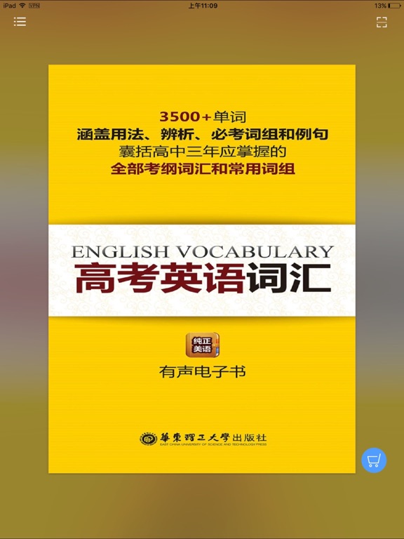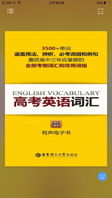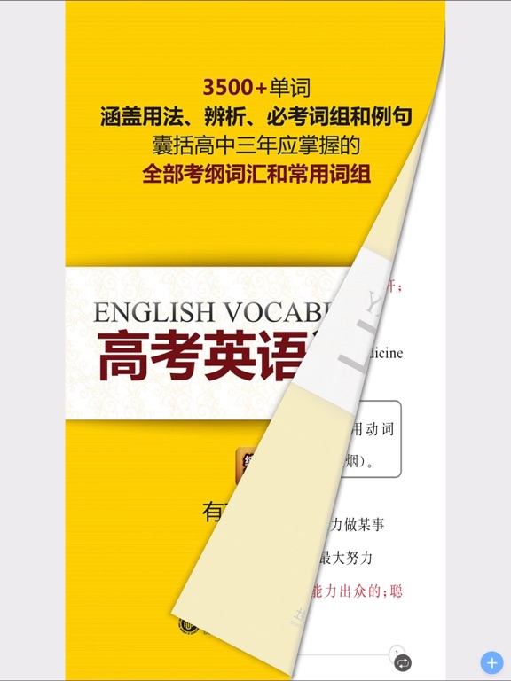 《高考英语词汇》纸书官方正版App(有声点读) 随时随地记单词,高考英语口袋宝典! 《高考英语词汇》是由华东理工大学出版社出版的一本快捷速记英语词汇宝典。本书同步高考考纲英语词汇要求,以简单有效的编排方式帮助高考考生迅速掌握1700+单词、300+词组。本书深受广大高考考生和英语学习者的热爱。 全新的移动端【高考英语词汇】App,在完整还原纸书内容基础上,优化了纸书编排、增加了有声点读功能,可点读、可循环,全面利用学生的碎片时间,放学路上也能学,掌握纯正地道的英语发音,不做“哑巴外语”,营造真实的外语学习氛围。 【App内主要内容】 按字母A-Z直接排序的考纲中三千五百多个单词, 附上用法、辨析、例句、词组,一个App就够了 【应用特色】 官方出品,保证原汁原味的内容呈现 有声点读,体验快捷高效的学习方法 讲解详尽,掌握三年所有的核心词条 一键支付,免去纸书购买的种种烦恼 本App由华东理工大学出版社联手“阅门户”团队倾情打造。 【联系我们】 e-mail:service@readoor.cn 技术支持:029-68518879修改了一些细小bug;